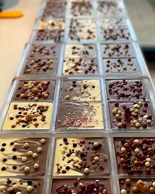 Wir bringen alles mit, was wir brauchen und jedes Kind kann seine eigenen Schokoladentafeln (3 quadratische kleine und 1 große runde mit eigenem Namen) gestalten mit Nüssen, Krispies und bunten Toppings. Daniela Brüggen erzählt kindgerecht in entspannter Atmosphäre gern mehr von der Handhabung der Schokolade und der Herkunft von Kakao. Je nach Saison und Gelegenheit können wir auch noch Lollies oder Schoko-Erdbeeren fertigen.